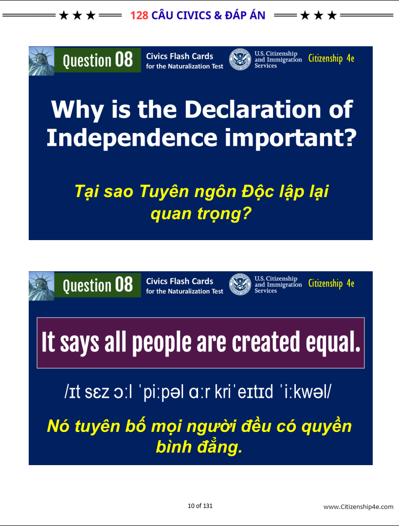 Cuốn ebook này tổng hợp 128 câu hỏi – đáp án civics phiên bản 2025, trình bày đơn giản, dễ nhìn và rất phù hợp cho cô chú đang chuẩn bị phỏng vấn quốc tịch Mỹ. Nội dung được biên soạn dựa theo tiêu chuẩn của USCIS, giúp cô chú ôn tập nhanh, nhớ lâu và luyện mỗi ngày trên điện thoại hoặc máy tính bảng.